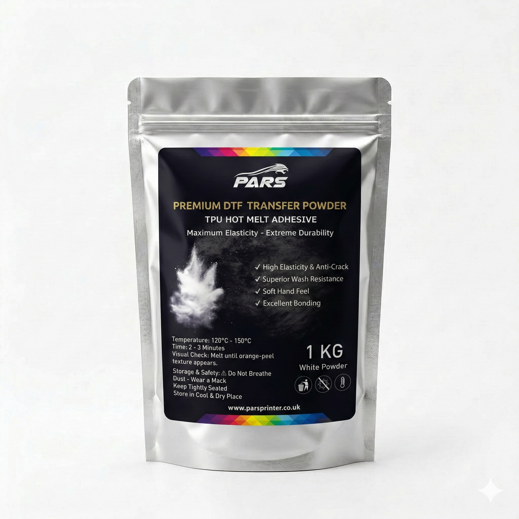 Premium 1kg PARS DTF Transfer Powder for durable, soft-touch textile transfers.